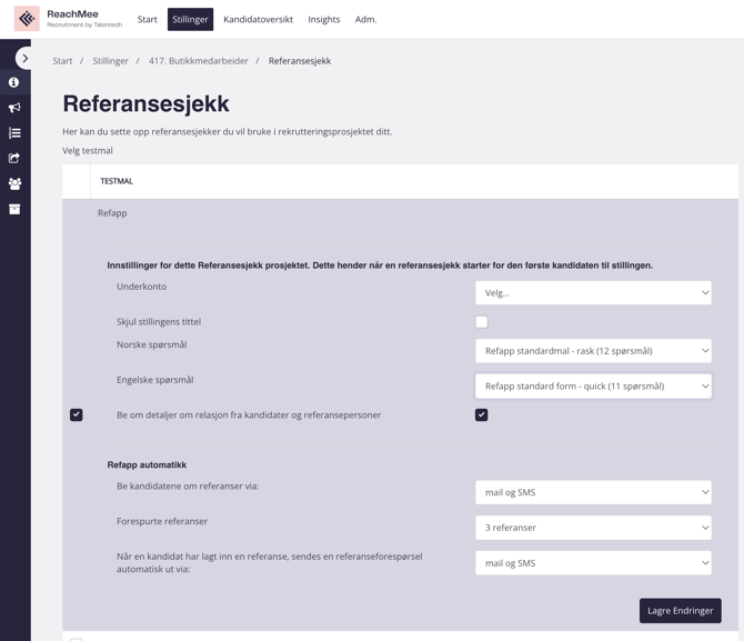 Før du kan starte en referansesjekk fra stillingen i ReachMee må du sette innstillingene for hvordan referansesjekken skal utføres.